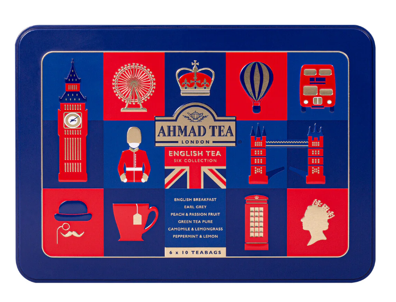 Η English Tea Six Collection Caddy της Ahmad Tea είναι μια ολοκληρωμένη συλλογή τσαγιού που συνδυάζει κλασικές μαύρες ποικιλίες, πράσινο τσάι, φρουτώδεις γεύσεις και αφεψήματα βοτάνων, καλύπτοντας κάθε προτίμηση και κάθε στιγμή της ημέρας. Ένα κομψό, σύγχρονο μεταλλικό κουτί που φέρνει την αυθεντική βρετανική κουλτούρα τσαγιού στο σπίτι ή στο γραφείο.